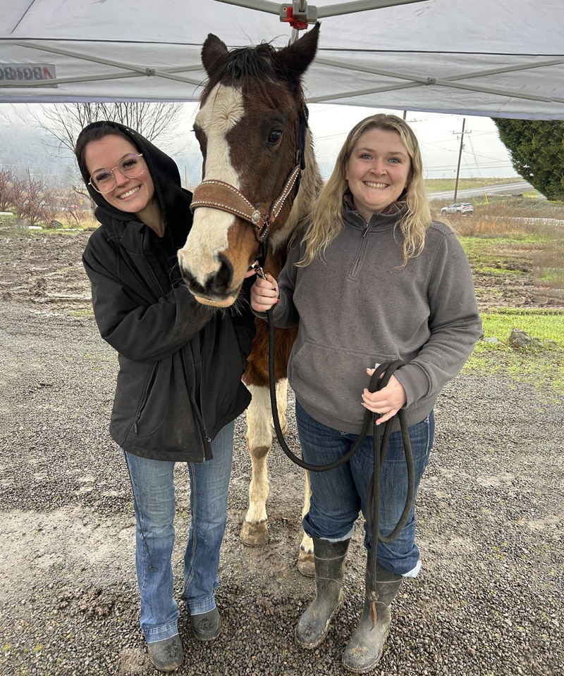 Three of our regulars—well-trained patients comfortable with the routine—arriving on a rainy day for on-site x-rays under our mobile canopy setup. This photo captures the kind of all-weather, field-based care we’re proud to offer our large animal clients.